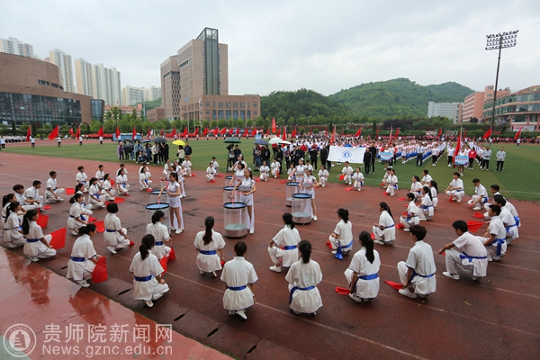 本网讯 5月12日上午,我校第六届体育节在足球场盛大开幕,虽然天公不作美,偶尔的阵雨并没有浇灭全校师生似火般的热情,看台上不时传来阵阵欢呼与呐喊。开幕式上,各学院入场方队创意不断,各自彰显青春的活力。