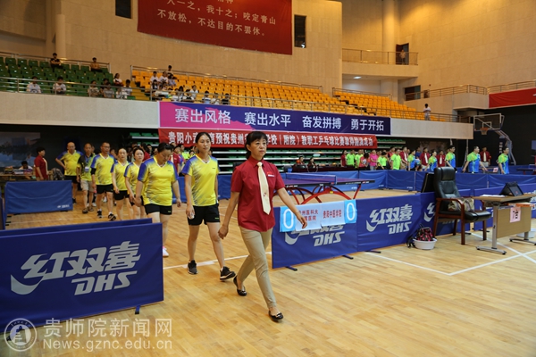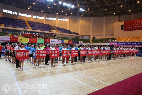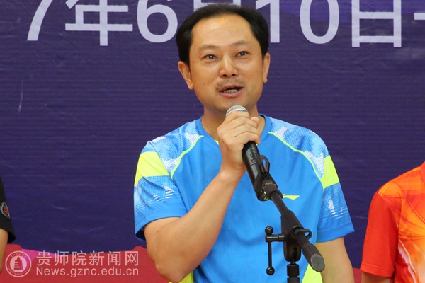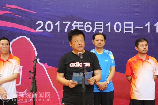 本网讯 6月10日上午,2017年贵州省直学校(附院)教职工兵乓球比赛在我校体育馆举行了开幕式。贵州省教育厅党组成员、省委教育工委副书记赵廷昌,原贵州师范大学校长、贵州省政协科教文卫专委会副主任伍鹏程,贵州师范大学副校长乙引,我校党委书记石培新,党委副书记令狐彩桃以及其他院校相关领导人出席活动。来自十八支院校参赛队伍以及裁判员参与了本次开幕式。令狐彩桃主持开幕式。