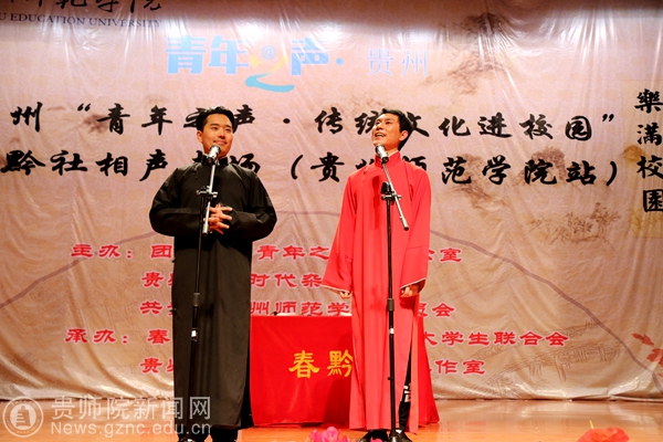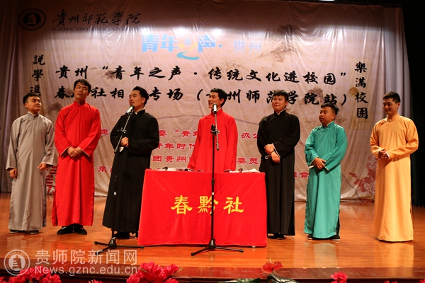 本网讯  中华民族有着悠久的传统文化,而相声更是中华民族传统文化的瑰宝,是中华民族传统曲艺当中最受人们喜爱的方式。为了加强我校师生对传统文化的深刻认识,5月11日晚上,由团省委青年之声办公室、贵州青年时代杂志社主办的“青年之声·传统文化进校园”在我校演播厅精彩演出。参加本次相声演出的有李大成、赵磊、张翰文、洪方舟、刘振峰、高振洋、马晓鹏等7位老师。