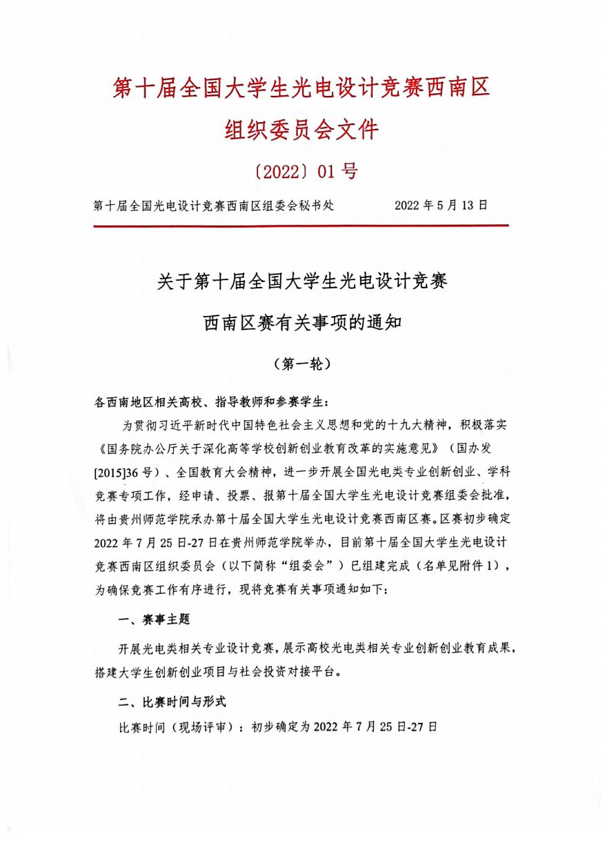 关于第十届全国大学生光电设计竞赛 西南区赛有关事项的通知 (第一轮)