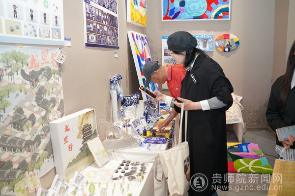 展览现场呈现为三大板块:在“山水秘境·龙里之韵”展区,绘画、陶艺等作品生动再现龙里的自然风貌与民族风情;“数绘未来·龙里映像”展区运用AI生成、三维建模技术,将非遗传说转化为数字影像作品;“物产创生·匠心传承”板块聚焦刺梨深加工、龙里河大桥等地域IP,开发出多个系列文创产品。