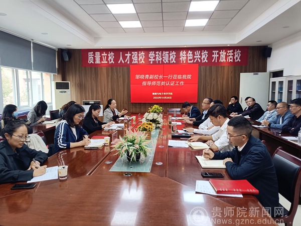 本网讯 2022年10月26日,校党委委员、副校长邹晓青一行分别到地资学院、物电学院调研指导地理科学、物理学专业师范类专业认证工作。教务处处长邓琴、教学质量监测与评估办公室主任任翠娟及党政办公室高媛老师陪同调研。地资学院、物电学院党政班子和师范类专业教师参加了调研座谈会。