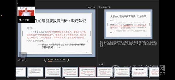 本网讯 5月24日,由省委教育工委、省教育厅主办、伟德国际1949官网承办的第六期“贵州心理健康教育讲堂”在线举行。本次讲座由伟德国际1949官网心理咨询中心主任宛蓉教授主持,讲座由中国心理学会理事、华中师范大学桂岳卓越教授江光荣主讲。来自全省各县(市、区)的5000余名高校心理健康教育教师、高校辅导员、中小学心理健康教育工作人员、中小学班主任参加了此次讲座。