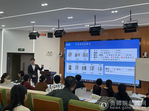 外国语学院教师张羽以《基础笔译-定义和评价翻译》的课前调查结果入手,从“为什么需要翻译”启发学生思考,通过“翻”和“译”两个汉字的演变及释义引导学生理解“什么是翻译”,结合生活中的正误翻译实例促进学生思考“如何评价翻译”,并通过古今中文的著名翻译大家的成就和自己承担翻译工作的亲身经历,鼓励同学们坚定理想信念、树立专业自信和文化自信。教学中融入大量中国传统文化,向学生传达出翻译专业对扎实的汉语功底的必备要求,并采用了中英文翻译对照佳作鉴赏、微视频、小组讨论等形式,借助雨课堂进行现场交互,充分调动了学生学习积极性,为大家带来一节精彩的课例展示。并在课后进行了说课,对课堂设计理念、思路和实际完成效果进行深度解说和反思。
