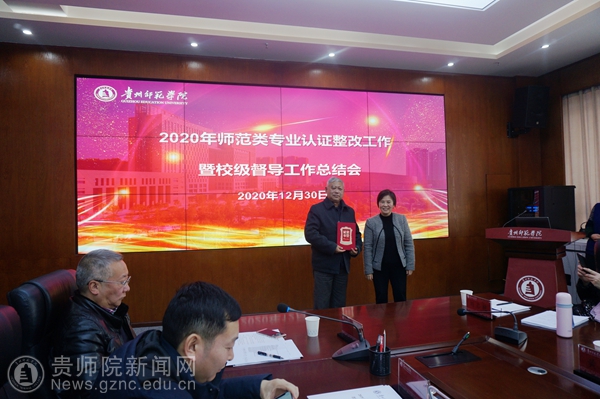 会议包括两项主要内容,首先,由质评办邓琴主任汇报了学校师范类专业认证工作推进情况,《伟德国际1949官网(汉语言文学)专业认证整改工作方案》及2021年认证工作安排;数学与应用数学专业、汉语言文学专业负责人分别汇报了专业认证整改工作开展情况; 2021年拟接受认证的英语、历史学、化学、美术学、音乐学、体育教育等6个专业的负责人分别汇报了认证工作推进过程中存在问题及需校、院两级整改解决的相关内容;其次,由邓琴汇报2020年校级督导工作、通报督导换届情况及2021年的督导工作要点;第三,由校级教学督导张莹、吴在东、黄天明分别就2020年各学院毕业论文(设计)、实习以及试卷工作的自评情况进行通报;其间,为感谢吴在东老师从事学校教学督导工作十年间为学校教学工作作出的积极贡献,韦维为校级督导吴在东老师颁发荣誉证书。