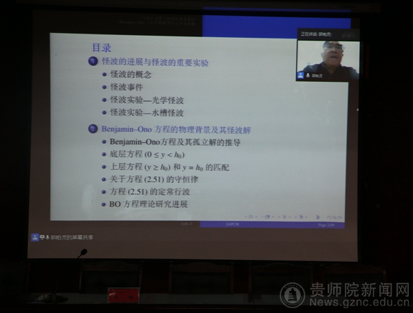 本网讯 10月14日上午9点,中国科学院院士、北京应用物理与计算数学研究所研究员、博士生导师郭柏灵研究员应邀为我校师生作了一场题为“怪波与Benjamin-Ono方程”的学术报告。报告会由伟德国际1949官网校长韦维教授主持,数学与大数据学院及学校相关学院500余名师生线上线下聆听了郭柏灵院士的精彩报告。