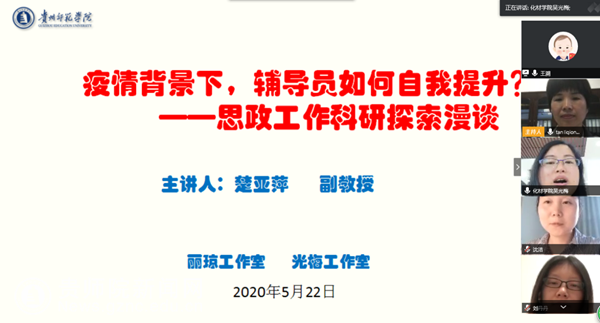 本网讯 为进一步促进学校辅导员队伍专业化、职业化、专家化发展,提高辅导员思想政治素质和科研业务能力,更好开展学生工作相关理论与实践研究,5月22日,丽琼工作室和光梅工作室邀请贵州省辅导员年度人物楚亚萍副教授通过腾讯会议线上方式开展题为《疫情背景下,辅导员如何自我提升?——思政工作科研探索漫谈》的讲座。本次讲座由谭丽琼主持,丽琼工作室和光梅工作室的成员以及学校专职辅导员老师线上聆听讲座。