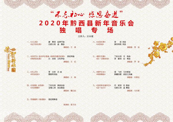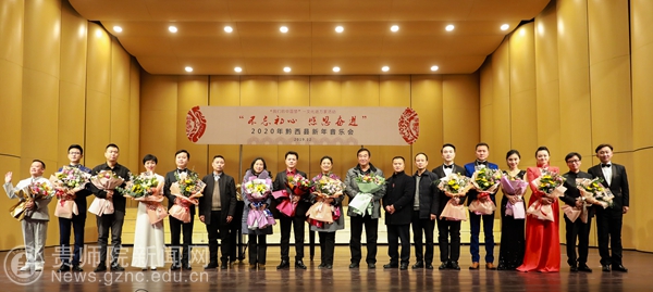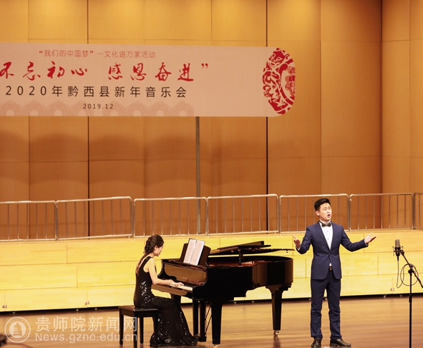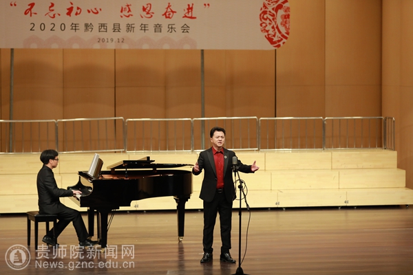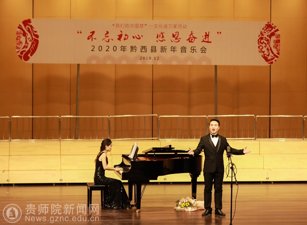 本网讯 12月28日下午,以“不忘初心·感恩奋进”为主题的黔西县2020年新年音乐会在水西大剧院精彩上演,我校有7名教师受邀参加了独唱专场音乐会的演出。黔西县政协主席罗智琼、黔西县人民政府副县长曾科、黔西县人大常委会副主任敖西洛、黔西县人大常委会副主任林琴和黔西县各界人民群众一起出席了音乐会。
