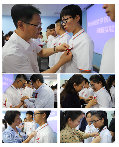为实验班新生佩戴校徽及班徽