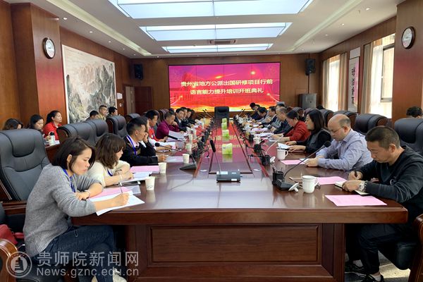 本网讯 4月8日上午,贵州省地方公派出国研修项目行前语言能力提升培训班开班典礼在我校信息楼二楼会议室隆重举行。省教育厅党组成员、省教育工会主席王慧、中国东盟教育交流周组委会秘书处办公室主任、贵州省教育国际交流协会秘书长王睿、省教育厅国际处处长刘万千、贵州省教育国际交流协会副秘书长陈小飞、贵州省教育培训与考试部副部长武跃华出席了开班典礼;我校郁钟铭校长、熊世桓副校长,国际交流合作处处长张瑶、外国语学院院长余学军、继续教育学院院长赵德肃、教务处副处长刘宪帮及国际交流合作处工作人员参加了典礼。典礼由贵州省教育国际交流协会秘书长王睿主持。