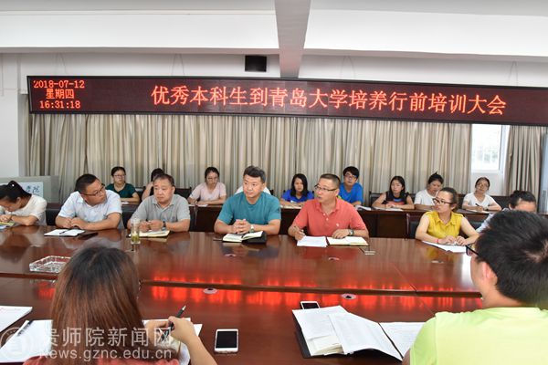 刘宪帮宣读了《2018年选拔优秀本科生到青岛大学培养学习实施方案》和《关于选派代慢慢等21名同学到青岛大学培养学习的通知》(贵师院党政办发〔2018〕16号)相关文件,就选拔学生赴青岛大学培养学习作了动员讲话,希望同学们参照我校本科人才培养方案,从个人兴趣和发展规划出发,合理、科学制定个性化的学习计划,在交流学习期间不断充实和提高自己,并要求同学们严格遵守双方学校的规章制度和纪律,用心体验第二校园生活,努力学习,刻苦钻研,学成归来。