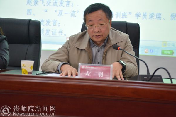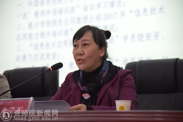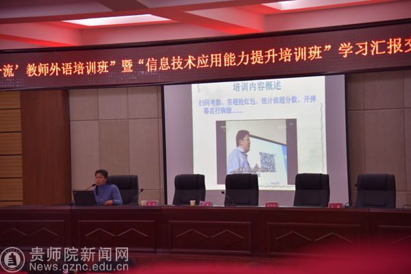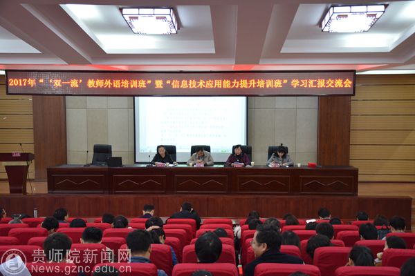 本网讯 3月13日下午,我校2017年“‘双一流’教师外语培训班”暨“信息技术应用能力提升培训班”学习汇报交流会在道德讲堂举行。外国语学院院长余学军;数学与计算机科学学院院长左羽;教学质量监测与评估研究中心、教务处部门领导;各学院(部)领导;参训学员;教师代表及教师工作处全体成员参加了会议。会议由教师工作处副处长王茜主持。