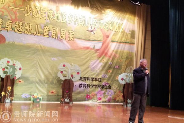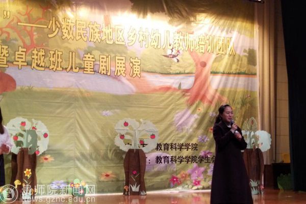 本网讯 11月23日下午,我校在逸夫楼演播厅隆重举行“国培计划(2017)——少数民族地区乡村幼儿教师培训团队研修项目”阶段总结。校级督导吴在东老师应邀出席晚会,教育科学学院党委书记彭祥友、副书记袁川、副院长黎平辉、副院长郑玉莲以及学院部分项目指导教师莅临现场,部分学生到场观看。总结典礼包括培训回顾、优秀学员颁奖及“国培计划(2017)” ——少数民族地区乡村幼儿教师培训团队暨卓越班儿童剧展演。