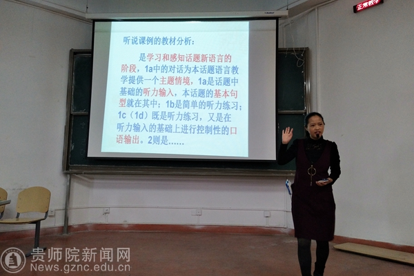 在讲座中,万丽还就听说课、阅读课和写作课的课堂设计进行了仔细的分析。学生们积极参与,与万老师互动积极,并且对不同课型的设计提出自己的疑问及看法。对于如何整合教材,设计层层递进的任务和活动,如何将课程进行综合运用,学生们都在听了万丽的讲座后积极讨论。尤其是万丽说的“在听力课上,要花大力气进行教学,渗透听力策略;听力课上不讲语法和句型,只是通过听、读、说来感知话题语言项目,帮助学生上口”的观点获得了学生的一致赞同。