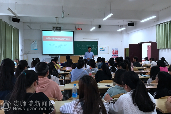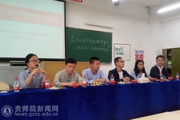 本网讯 5月21日,教育科学学院应用心理学专业在我校逸夫楼303教室举行“毕业实习—未来职业畅想”经验交流会。会议由应用心理学专业教研室主任金欢欢主持,共邀请到现工作于贵州经贸职业技术学院、龙里县民族完全中学、贵州省兴义监狱、贵州师范大学和贵阳海之源心理咨询服务中心等单位的五名应用心理学专业优秀毕业生到场交流。