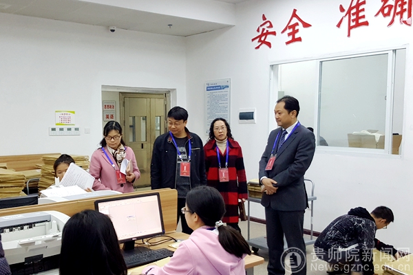 本网讯 3月13日,校党委书记石培新、副校长郭文,到我校国家教育考试评卷基地视察指导工作,并看望了正在进行“贵州省中小学教师资格证考试”评卷扫描工作的教师和工作人员。评卷基地办公室主任赵德肃、副主任王先华、扫描组组长刘红等陪同视察。