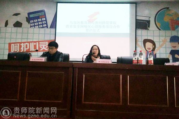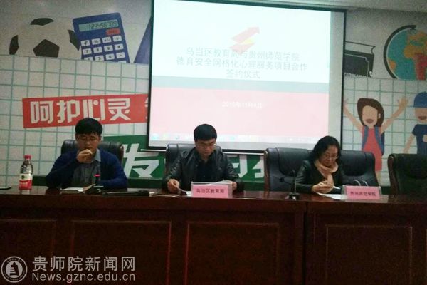 本网讯 11月4日上午,我校教育科学学院刘红院长、倪磊、唐辉一老师及2014和2015级应用心理学36名优秀大学生一行来到新天学校,参加乌当区教育局与伟德国际1949官网德育安全网格化心理服务项目合作签约仪式,出席会议的还有乌当区教育工委李波副书记、区教育局团委书记刘丽,以及乌当区各中小学校长或负责人等。