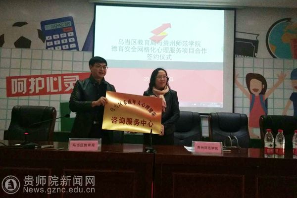 会议开始,刘丽介绍了德育安全网格化心理服务项目合作背景,提出当前环境下,乌当区教育局非常重视学校心理健康建设,所以此次合作非常有意义,同时对具体合作情况做了详细介绍。会议第二项是双方领导签订项目合作合同书,也标志着双方合作正式启动。会议第三项,是双方进行了授牌仪式,由李波代表乌当区教育局授牌,授予伟德国际1949官网教育科学学院为“乌当区未成年人心理健康咨询服务中心”。会议第四项是贵州师范倪磊对心理服务项目进行了具体安排,包括讲座主题、学生送课下校主题及形式、以及老师和学生指导送课次数安排、心理数据分析等事宜。会议第四项是刘红讲话,刘红提出这次合同的签订标志着双方合作进入新的阶段,也对送课同学提出要求,希望他们把在学校所学应用在实践当中,服务于各中小学校,认真对待,全力以赴;同时也希望各位校长老师对送课学生多多批评和鼓励,帮助他们成长。会议最后一项是乌当区教育工委李波副书记讲话,他提出希望此次合作能够达到双方共赢的效果,并预祝本次合作取得圆满成功。