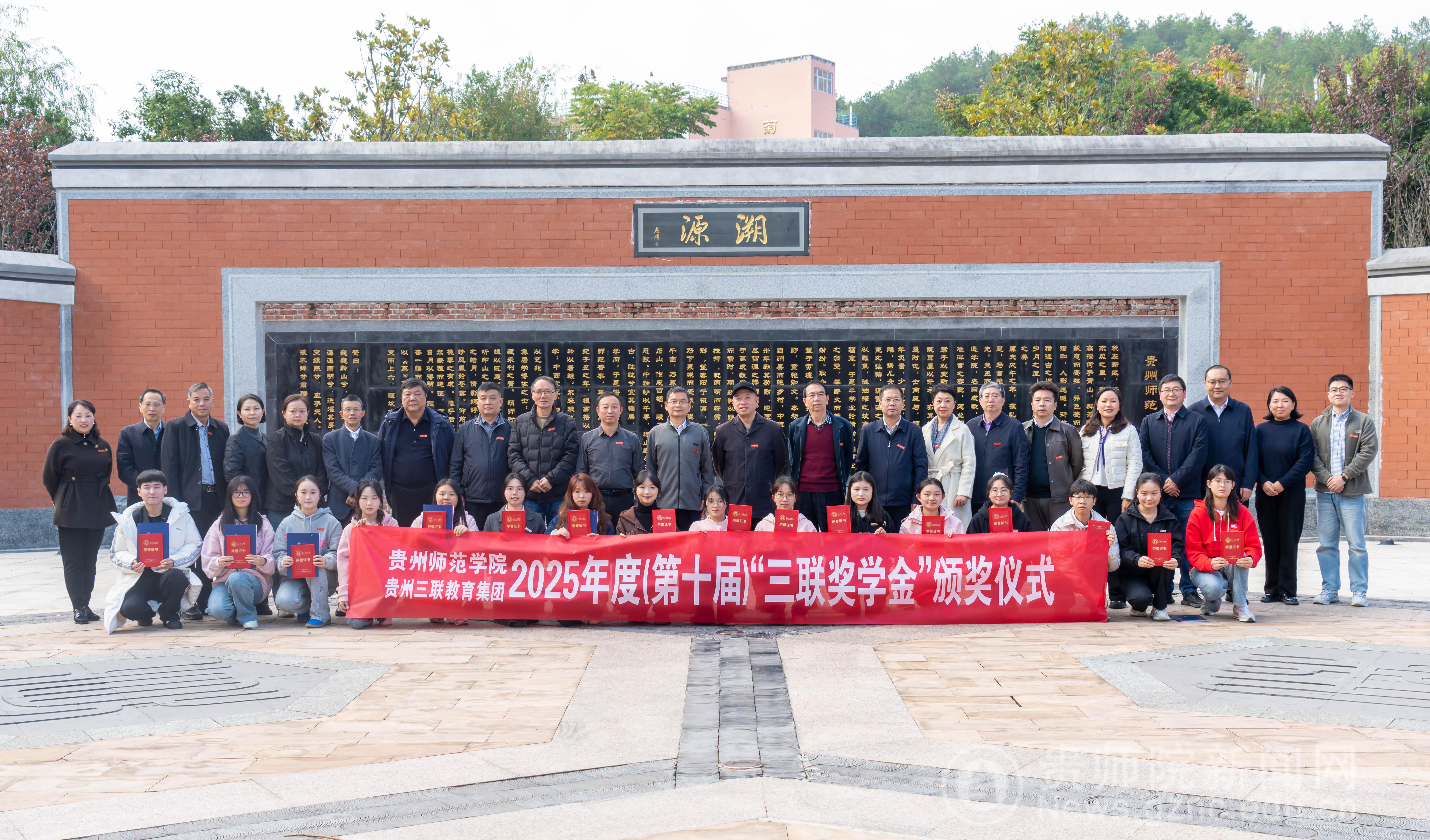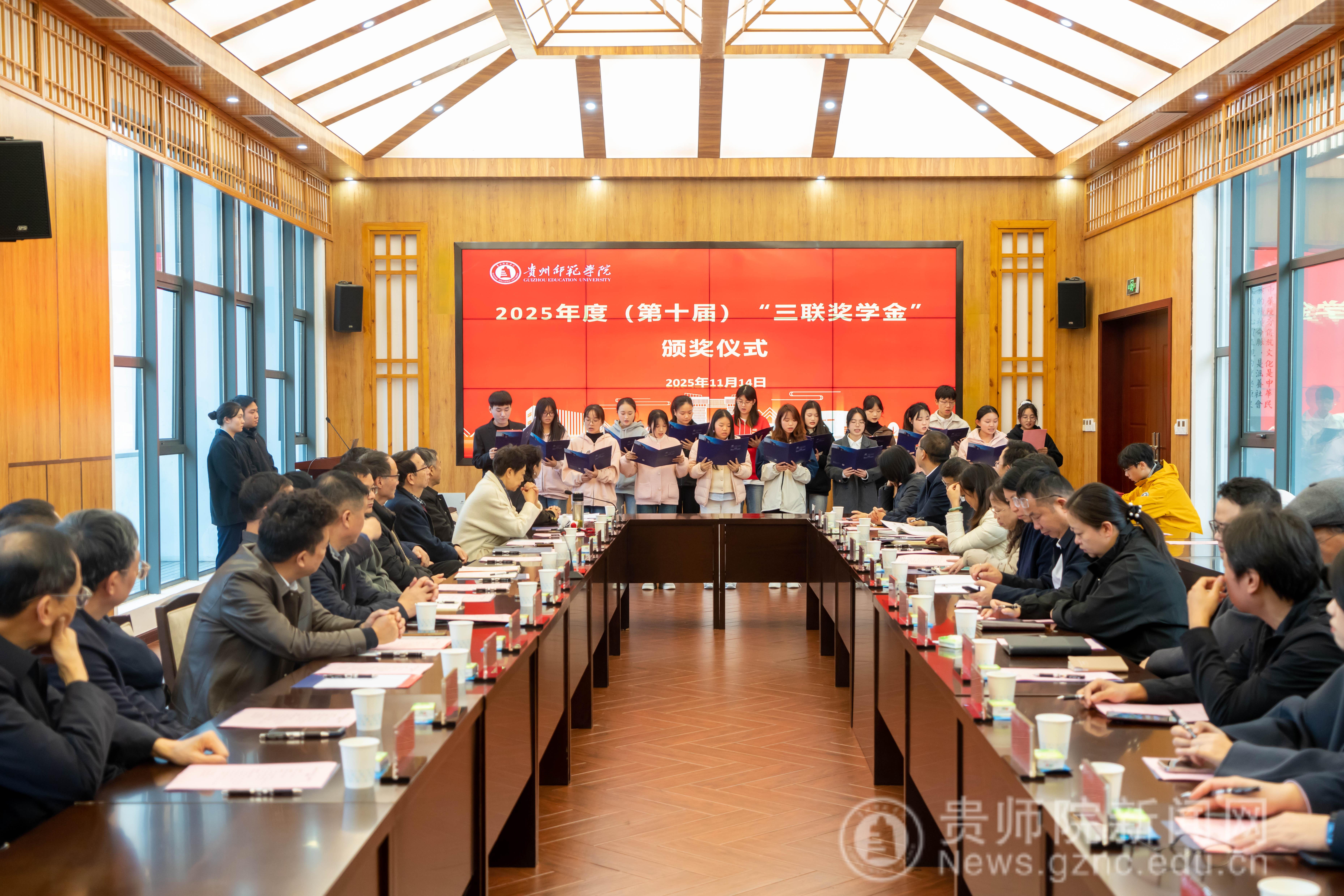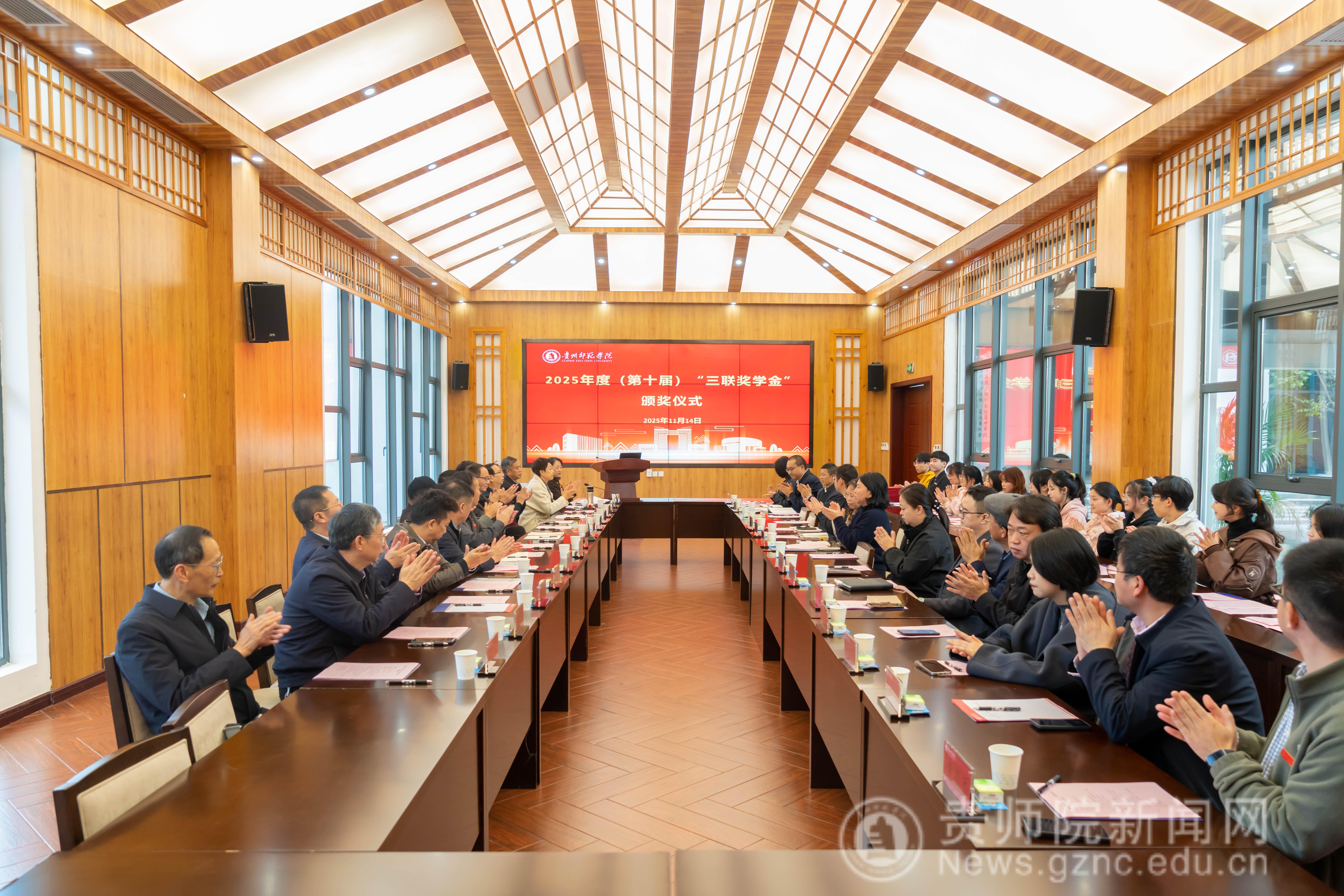 本网讯 11月14日,伟德国际1949官网2025年度(第十届) “三联奖学金”颁奖仪式在印山书院山水讲堂隆重举行。学校原校长、贵州省伟德国际1949官网校友会会长郁钟铭,伟德国际1949官网党委常委、副校长陈真波,贵州三联教育集团董事长、校友会副会长肖开玉等一行嘉宾,各二级学院党委书记和老师,以及16名获奖学生参与。仪式由校友办主任敖永凤主持。