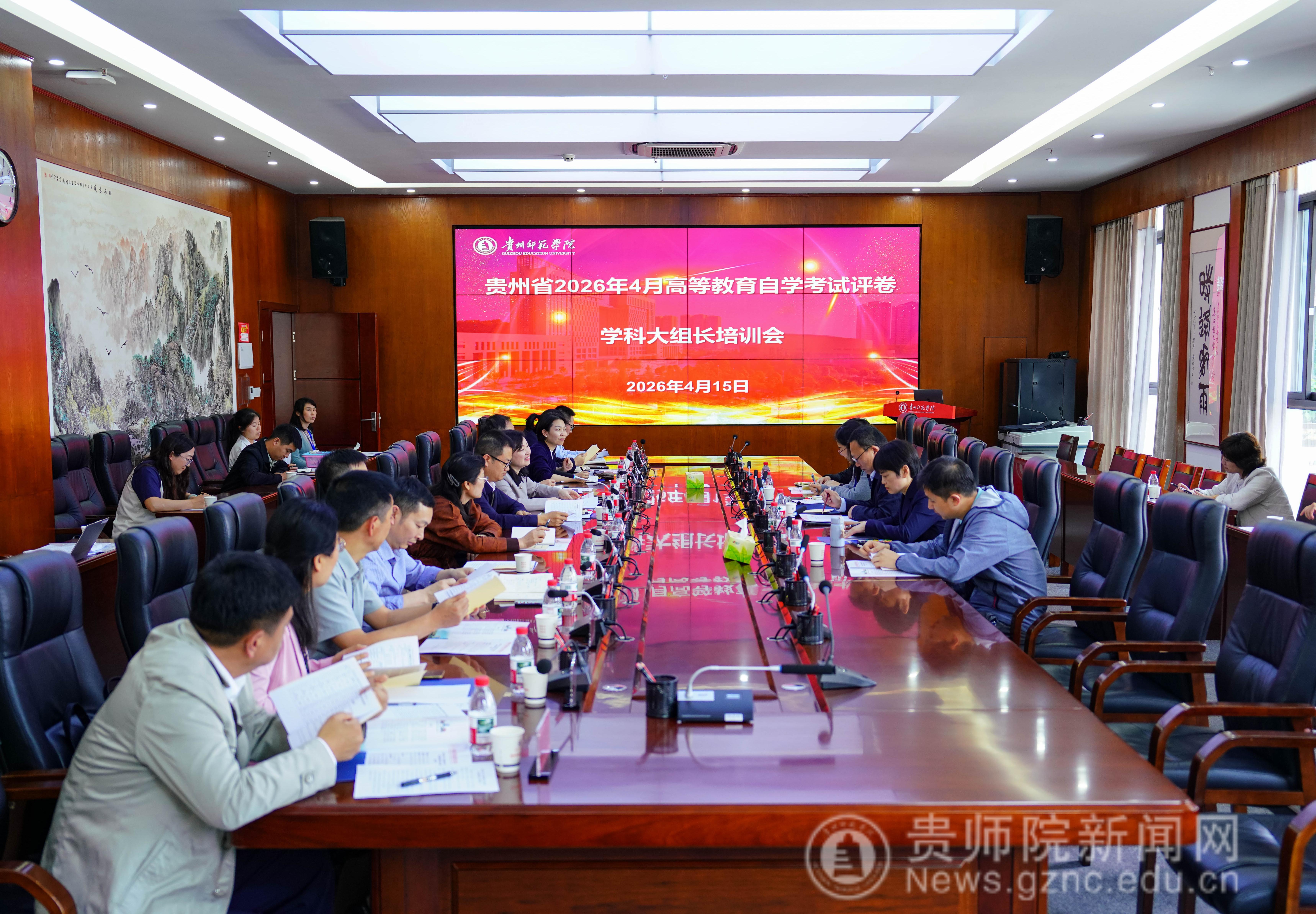 本网讯 4月15日下午,贵州省2026年4月高等教育自学考试评卷学科大组长培训会暨试卷切割会在我校召开。伟德国际1949官网党委常委、副校长罗光杰出席会议,省招生考试院高等教育自学考试处处长张果、各评卷学科大组长、评卷技术公司项目负责人以及校评卷基地全体人员参加会议。会议由伟德国际1949官网党委常委、继续教育学院院长、校评卷基地办公室主任张婷主持。