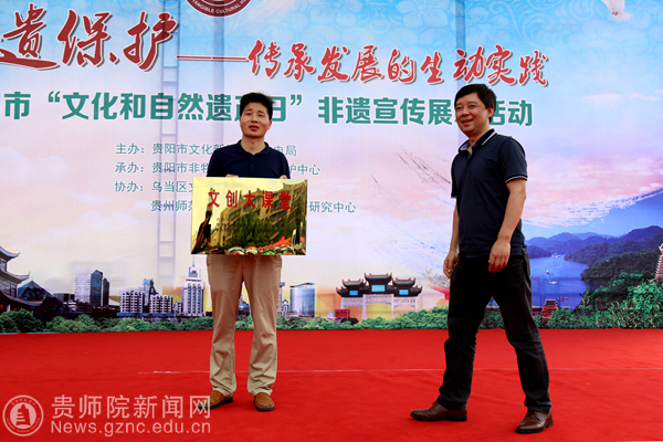 在开幕式上,贵阳市文化新闻出版广电局向我校大学科技园授予了“贵阳市非物质文化遗产数据库”、“贵阳市非物质文化遗产协同创新·智造基地”和“文创大课堂”三块牌匾。