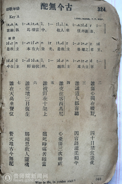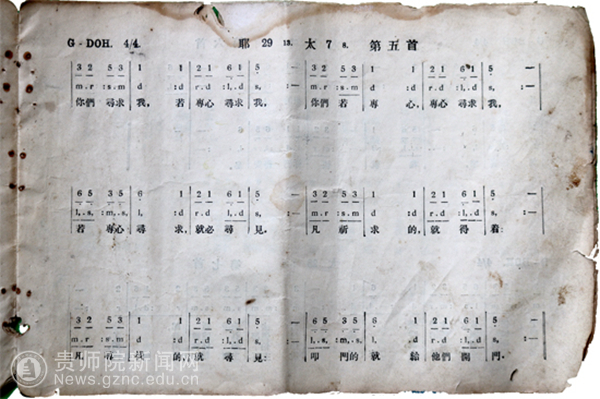 本网讯 日前,地理与旅游学院文化地理专家蒋英在追溯西方音乐文化传入贵州的历史线索时,在黔西北、黔中部分山区,较早受西方宗教影响区域内的苗族村民家中发现留存至今的欧美字母简谱,目前保存的有《国韵经歌》《颂主聖歌》等歌谱。