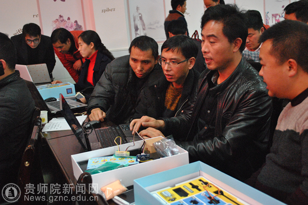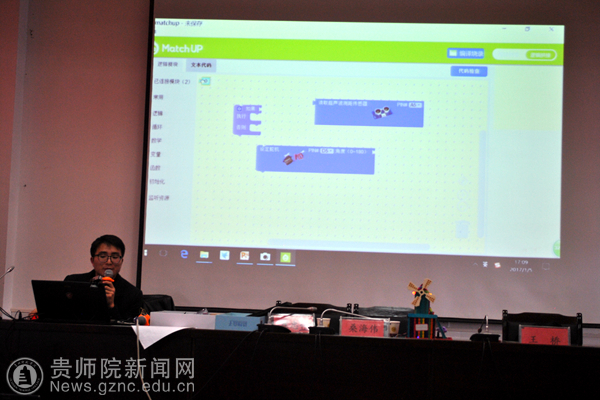 我校教师作了题为《贵师院大学生信息技术创新创业成果及创客教育》专题报告,创客教师王桥、桑海伟在我校学生助教的配合下,通过“造物盒子”这一创客工具指导参训教师制作了创客作品。