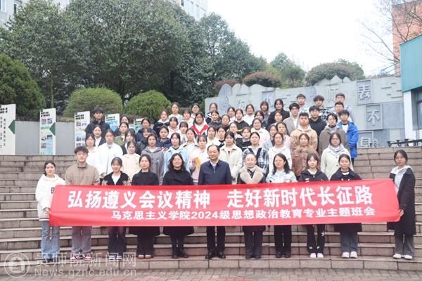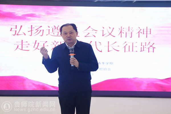 本网讯 2025年是纪念遵义会议召开90周年,也是习近平总书记作出“运用好遵义会议历史经验,让遵义会议精神永放光芒”重要指示10周年。为全面贯彻党的二十大、二十届三中全会精神,深入学习贯彻习近平总书记关于总结运用遵义会议历史经验的重要论述,深化青年大学生的爱国主义、集体主义、社会主义教育,培养担当民族复兴大任的时代新人,3月14日,校党委书记石培新在一站式学生社区服务中心,为马克思主义学院2024级思想政治教育专业讲授“弘扬遵义会议精神,走好新时代长征路”的主题班会。校党委委员、副校长、马克思主义学院党委书记任洁、校党委学工部部长何毅、马克思主义学院院长兼党委副书记金凤参加。