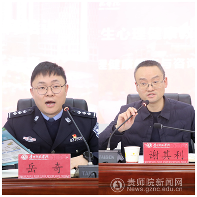 会上,学工部部长刘红玲、教务处处长邓琴、保卫处副处长刘宪帮、乌当区高新路派出所所长岳奇、心理健康教育与咨询中心负责人谢其利,分别就新学期学生管理与辅导员工作、毕业生学籍学历和学位授予相关工作、校园安全稳定工作、防网络诈骗安全教育工作、心理健康教育工作与参会人员进行了交流。