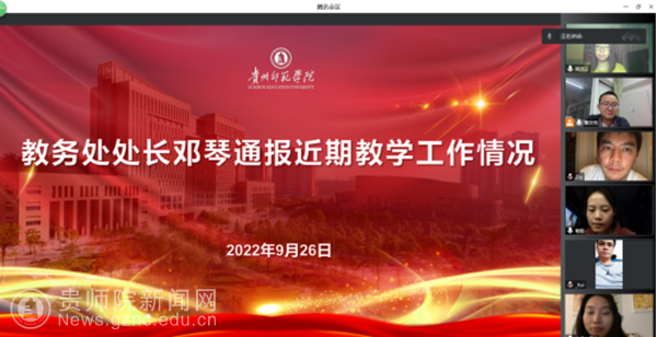 本网讯 为做好疫情防控期间党支部学习教育工作,引导支部党员在疫情防控工作中进一步发挥先锋模范作用,9月26日,教务处党支部以线上会议形式组织开展9月份主题党日活动,围绕“喜迎党的二十大·我为群众办实事·服务师生展担当”主题,深入开展政治理论学习,并传达相关文件精神,会上还进行了交流讨论并部署有关工作。支部全体党员、教务处处长邓琴等党外人士参加活动,校党委委员、副校长邹晓青以普通党员身份参加活动并发言。