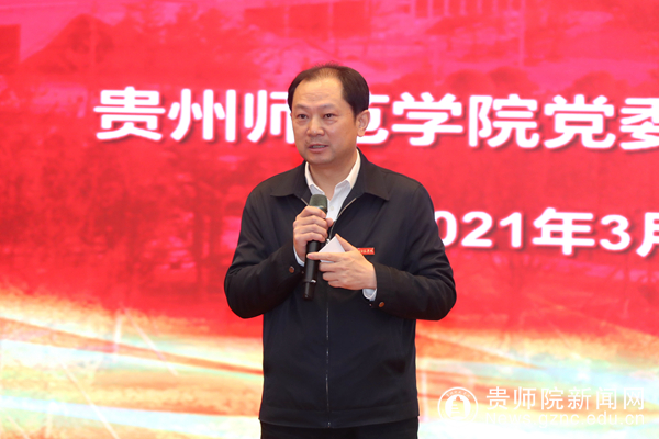 石培新首先从“四个时刻”为学生们阐释了充分认识习近平总书记视察贵州的重大意义。石培新说,总书记这次视察贵州,正值立春和农历小年,总书记在贵州制作当地传统节日食品黄粑、认真察看春节前“菜篮子”、“米袋子”、“果盘子”等供应保障情况,饱含了对贵州各族干部群众的特殊关怀、特别厚爱;总书记在中央将召开脱贫攻坚总结表彰大会的时刻来贵州,沿途所见是一派欣欣向荣景象,对我省脱贫攻坚工作给予了高度肯定;总书记在“十四五”开局的关键时刻视察贵州,提出贵州发展的总体要求,为开启我省全面建设社会主义现代化新征程提供了行动纲领、指明了前进方向、注入了强大动力;总书记在在建党100周年的历史时刻视察贵州,回顾了红军长征历史特别是遵义会议的历史,为全省广大党员干部进行了深刻的党史党性党风党纪教育。石培新还饱含深情地说,习近平总书记这是第六次到贵州,也是今年第一次到地方开展综合性调研,是贵州发展史上具有里程碑意义的大事。全省各族干部群众都沉浸在总书记给我们带来的兴奋、温暖、幸福、喜悦之中,作为师院人,要发自内心的感恩党、感恩党中央、感恩总书记。