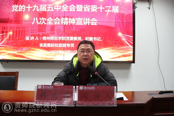 韩兵兵还带领大家对省委十二届八次全会精神进行了传达学习。他指出,“省委十二届八次全会是在全省上下深入学习贯彻党的十九届五中全会精神之际,在贵州66个贫困县全部脱贫摘帽,即将开启全面建设社会主义现代化新征程的关键时刻,召开的一次十分重要的会议。谌贻琴书记在全会上的重要讲话,高瞻远瞩、内涵深刻,既充分体现了中央要求,又高度符合我省实际,是新时代推动贵州经济社会高质量发展的重要遵循。”他饱含深情地对全会中“贵州撕掉了千百年来绝对贫困的标签”和“被习近平总书记赞誉为党的十八大以来党和国家事业大踏步前进的一个缩影”进行了较为详细的解读。他强调了全会关于纪检监察工作高质量发展的安排部署,要求全校纪检监察干部把握全会精神实质,应势而动、勇于担当、善作善成,积极贯彻落实全会精神,推动学校纪检监察工作高质量发展。