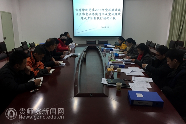 本网讯 12月11日上午,副校长郭文率历史与档案学院党委书记吴靖霞、马克思主义学院党委书记周永杰、音乐与舞蹈学院党委副书记朱晨刚、马克思主义学院施承成一行到我院检查2018年党风廉政建设主体责任落实情况及党风廉政建设责任制执行情况。体育学院党政领导班子,副科级以上干部,各党支部书记及办公室相关人员参加了汇报会。会议由党委书记韩山主持。