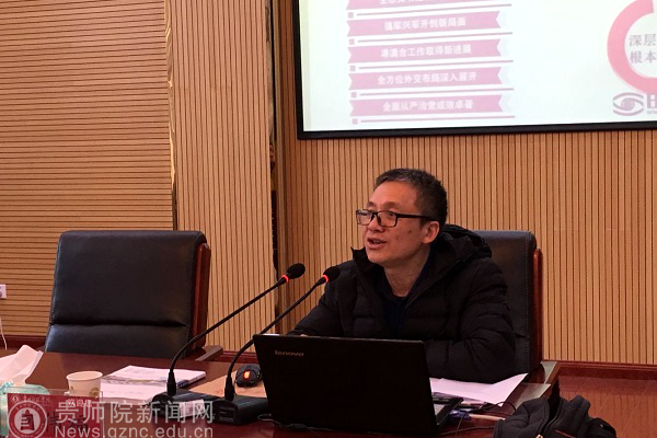 本网讯 12月25日,根据《贵州省委教育工委 教育厅关于<学习宣传贯彻党的十九大精神“七进”工作之进校园工作方案>通知》的要求,在逸夫楼艺术学院会议室,贵州省委教育工委高校马克思主义学院院长宣讲队成员、贵州财经大学马克思主义学院院长何伟福教授到我校宣讲党的十九大精神,马列主义教学部教师代表、经济与政治学院思想政治教育专业学生代表80余人参加了学习报告会,学习报告会由马列主义教学部负责人王天桥主持。