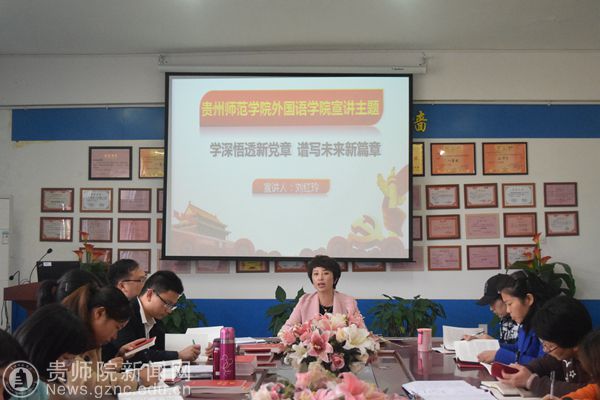 讲精品党课,解读十九大。10月25日下午,学校党委副书记令狐彩桃在外国语学院党群工作站为党员学生、入党积极分子上《学习党的十九大精神》的专题党课。11月10日,学校纪委书记王之瑞到学院开展宣讲,为全体教工党员作了题为《新时代 新理念 新征程——学习党的十九大精神点滴体会》的专题报告,并为党员们送上十九大新修改的党章。11月7日,学院院长余学军为广大学生干部和学生党员开设了“从十九大报告看坚定文化自信”专题讲座;10日,学院党委副书记刘红玲以《学深悟透新党章 谱写未来篇章》为主题,带领全体教工党员学习了新党章。11月20-24日,学生各党支部以微信等新媒体为平台,开展“指尖党课”视频录制大赛。