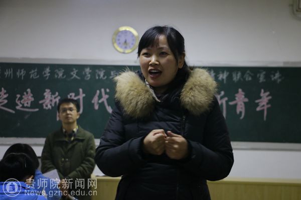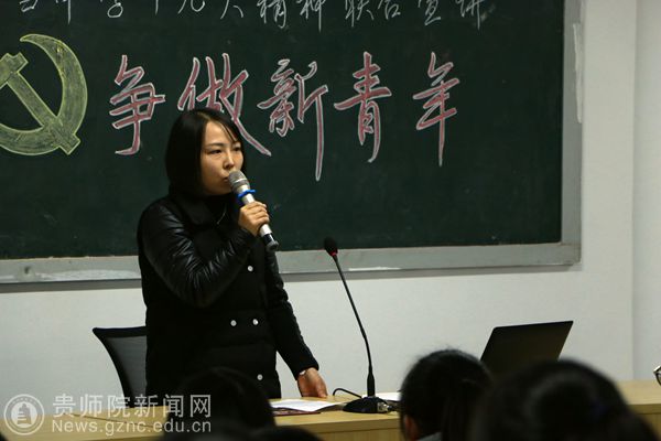 文学院团委学生会第十三届主席陈秀珍同学作最后的宣讲,主题为“习近平在参加党的十九大贵州代表团讨论时的讲话”。她指出习近平总书记在参加党的十九大贵州省代表团讨论时的讲话,体现了习近平总书记对贵州的关心,对我们省打赢脱贫攻坚战坚定了信心、鼓舞了士气。她表示作为新时代的新青年,我们要牢固树立新思想,要时刻牢记新使命,刻苦锤炼新本领,奋发展现新作为。广大青年学生是建设社会主义现代化强国的中坚力量,推动贵州建设和发展,青年学生肩负时代使命、义不容辞。