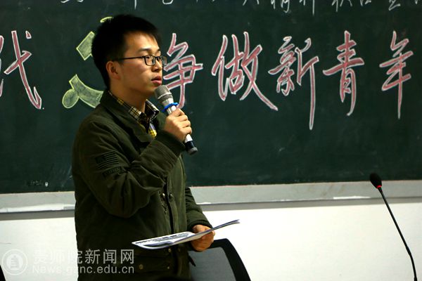 2014级汉语言文学三班班长黄巍宣讲主题为“十八大以来党和国家取得的成就”。他指出,党的十八大以来,国家在各方面各领域都取得重大进步,这一切都是在中国共产党的领导下和全国各族人民共同努力下所取得的成果。黄巍用具体实例进行了分析,指出党带领国家越走越好的同时,大家也要踏踏实实继续学习生涯,夯实基础,牢记初心,迎来更好的未来。
