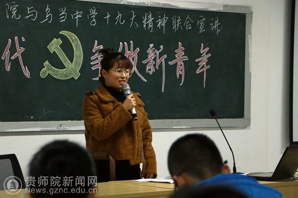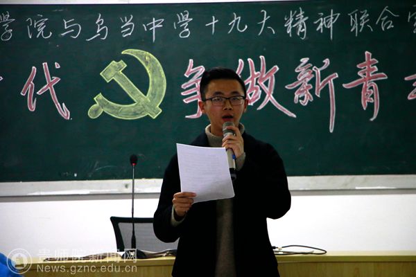 本网讯 为将党的十九大精神学懂、弄懂、做实,用青年教育青年、青年影响青年的方式,使党的十九大精神深入当代青年心中,11月23日下午,伟德国际1949官网文学院与乌当中学联合举办党的十九大精神宣讲活动。活动由文学院学生第二党支部书记潘源主持。
