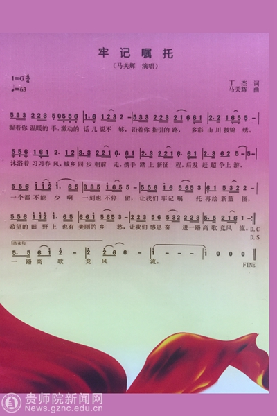本网讯 11月6日,歌曲《牢记嘱托》CD制作完成。在全国上下掀起学习宣传贯彻党的十九大精神热潮之际,艺术学院院长、国家一级演员、男高音歌唱家马关辉教授再次携手贵州音乐文学学会副主席丁杰,创作并演唱《牢记嘱托》,用歌声表达贵州人民感恩党中央感恩习近平总书记,牢记嘱托走进新时代,感恩奋进开创新未来的信心和豪情。