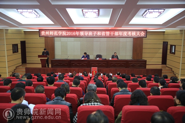 本网讯 1月6上午,我校2016年领导班子和省管干部年度考核大会在文韬苑二楼道德讲堂召开,本次测评会是省委组织部对省管领导班子和领导干部进行年度考核的重要内容之一,旨在全面贯彻从严治党、从严管理干部的新要求,认真落实中央和省委关于加强干部考核工作的新精神。省委组织部考核组成员黄智珉到会指导,全体校领导、全体处级干部参会,校长李存雄主持会议。