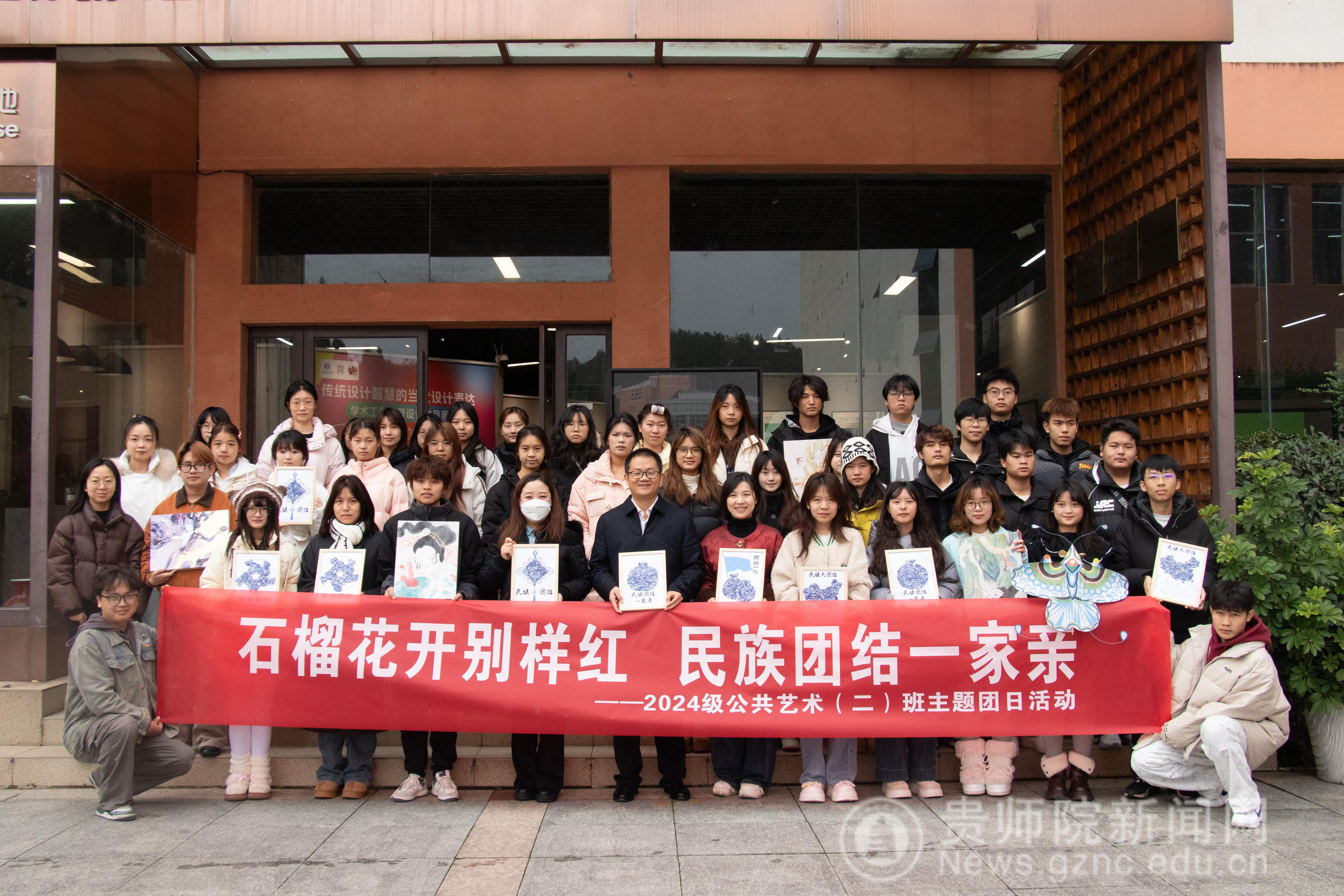 本网讯 为深入学习贯彻习近平总书记关于加强和改进民族工作的重要思想,12月3日,伟德国际1949官网美术与设计学院于艺术实践工坊精心筹备并成功举办了一场极具教育意义与专业特色的“民族大团结 共画同心圆”主题团日活动。校党委常委、副校长罗光杰,校党委委员、团委书记周煜,美术与设计学院党委书记郝进欣,院党委副书记邱琴,院团委副书记黄婧,辅导员欧俐岑以及2024级公共艺术二班全体同学齐聚一堂,共同参与此次活动。