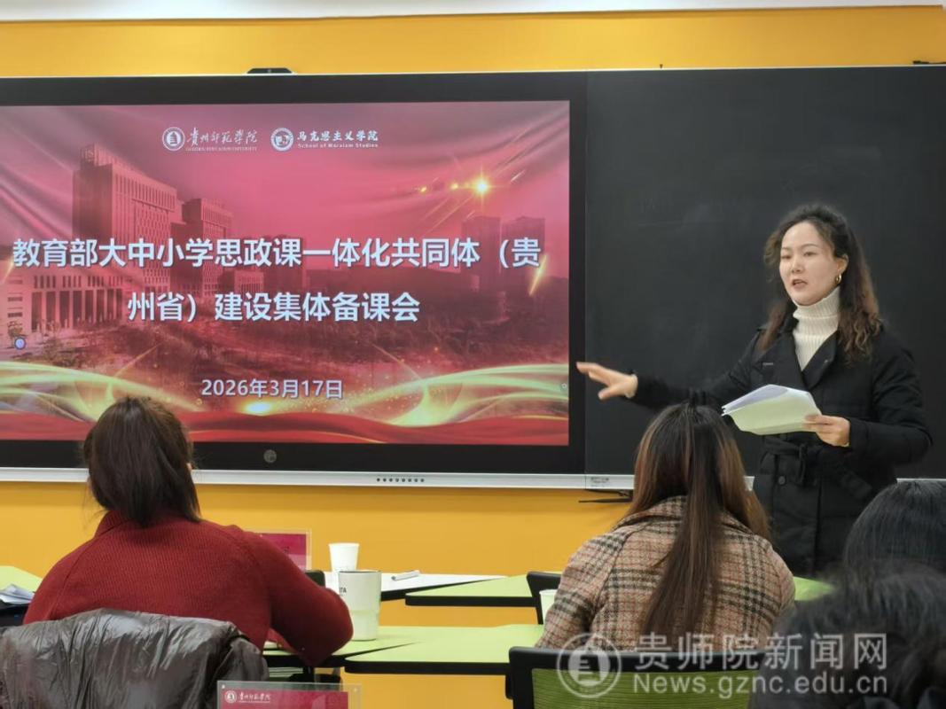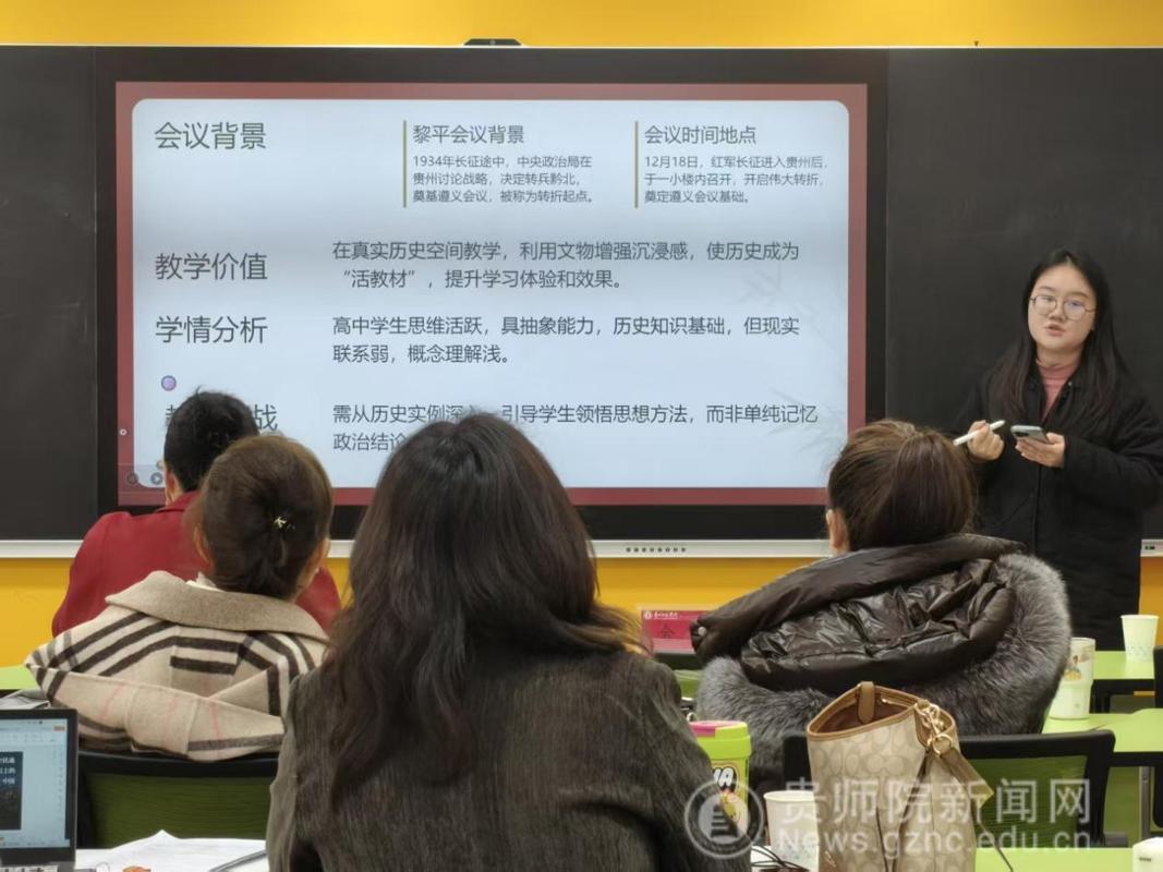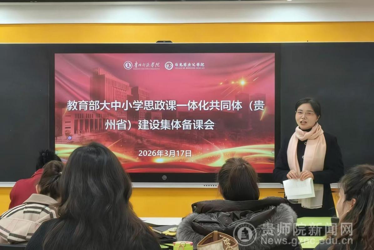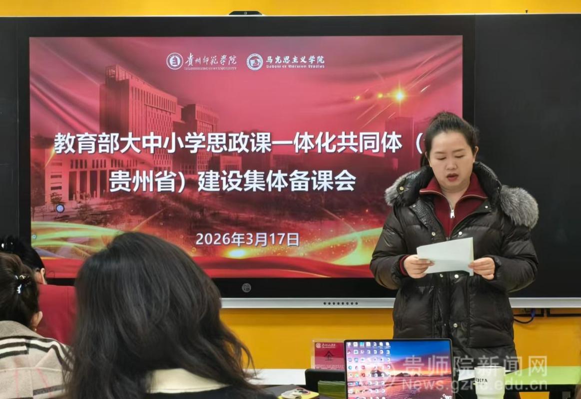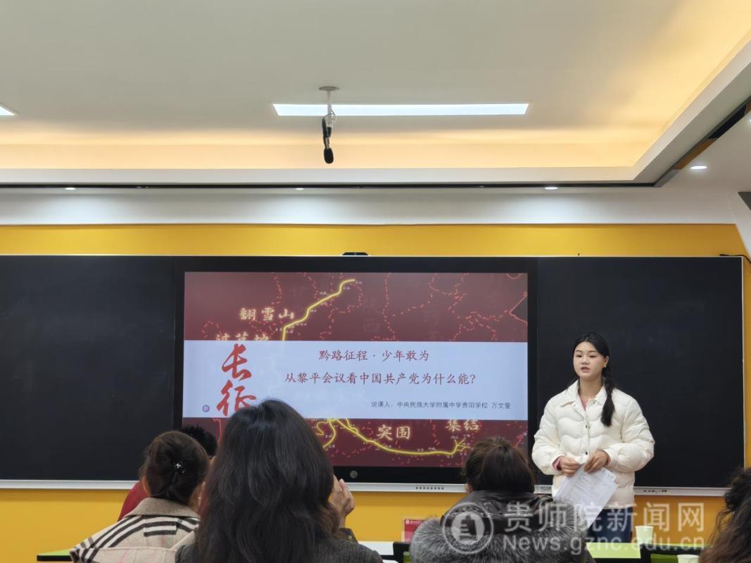 备课会伊始,马克思主义学院院长金凤教授就本次集体备课会的目的、意义、主题进行了说明。她指出,推进大中小学思政课一体化建设是新时代党和国家推进思政课建设的重要举措,是贯彻落实习近平总书记“3·18”讲话精神的重要抓手,希望各学段教师精诚合作、共同进步。备课会上,来自贵阳幼儿高等专科学校的尹湘旭、铜仁幼儿高等专科学校的罗雨露、贵州省实验中学的汪凡瑜、贵阳一中的陈卓、贵阳女子职校的陈怡、毕节市财贸学校的安丽、中央民大附属中学的万文萱、贵阳市第十八中学的江丽娟、贵阳市实验小学的杨薇薇、省府路小学的邓倩倩等17位思政课教师以“长征在贵州”为主题,聚焦黎平会议精神,以说课的形式进行了分享、交流、研讨。贵州省实验中学正高级教师杨梅对各位老师的说课内容进行点评时指出,黎平会议是极具贵州特色的思政课教学资源,各学段思政课教师用好、用活本土红色资源,对高质量推进大中小学思政课一体化建设具有重要意义。
