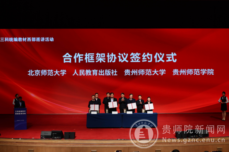 本网讯 2024年12月18日至21日,三科(道德与法治、语文、历史学科)统编教材西部巡讲活动在遵义市举行。校党委副书记邹晓青带领马克思主义学院、文学与传媒学院相关教师参加活动,并代表学校与北京师范大学、人民教育出版社、贵州师范大学共同签署合作框架协议。