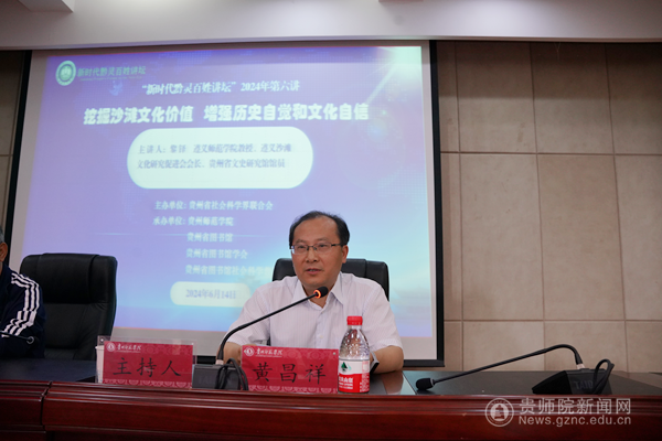 本网讯 2024年6月14日上午,贵州省新时代黔灵百姓讲坛第六期专题讲座在伟德国际1949官网文韬苑道德讲堂举行,讲座题目为《挖掘沙滩文化价值,增强历史自觉和文化自信》。本次讲座由贵州省社科联主办,伟德国际1949官网承办,遵义师范学院教授、遵义沙滩文化研究促进会会长、贵州文史研究馆馆员黎铎老师主讲。贵州省社科联党组成员、副主席黄昌祥主持本次讲座,贵州省社科联李政飞部长、黄莉调研员及伟德国际1949官网马克思主义学院全体师生及聆听了讲座。