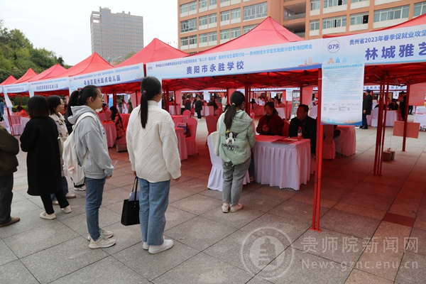 招聘会现场人头攒动,气氛热烈,众多毕业生积极与用人单位沟通交流,了解岗位需求、薪酬待遇等情况,主动寻求心仪岗位。中共贵阳市乌当区委人才工作领导小组、中共贵阳市花溪区委人才工作领导小组领导, 二级学院领导、辅导员亲临招聘会现场,与参会的用人单位和求职的毕业生亲切交谈,深入了解人才需求情况,鼓励毕业生树立科学合理的就业观,尽早就业。本次招聘会共有新天九年制学校、乌当区第二实验小学、贵阳市为明高级中学、高坡云顶小学、花溪区南溪学校、中国人寿保险股份有限公司、中城投(贵州)生态环保有限公司、贵州谨权律师事务所等99家招聘用人单位参会。招聘单位涉及教育服务、保险、融媒体、电子信息制造、旅游等多个领域企业,囊括我校大部分专业,提供招聘岗位1600余个,接待毕业生2000余人次到场沟通交流,接收简历1200余份,达成就业意向200余人。