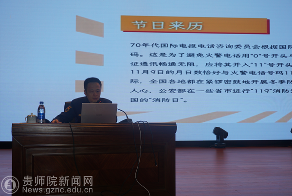 11月25日下午,乌当应急救援大队参谋赵永平应邀到我校为学生开展消防知识培训讲座。赵永平首先向大家讲解了基本的消防知识,涉及火灾发生的原因、火场逃生基本知识等内容,随后为大家列举了典型火灾案例,发人深省,让大家切实体会了具备基本消防安全知识的重要性。