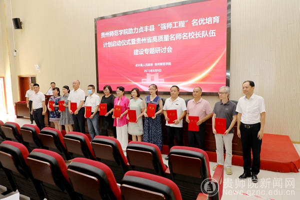 启动仪式上,贞丰县人民政府、伟德国际1949官网联合为13名贵州省名师名校长代表颁发贞丰县“强师工程”指导专家聘书。并进行了名优计划培育结伴签约仪式。省级名校长代表贵州师范大学附属中学党总支书记王丽萍、贞丰县名优培育对象代表贞丰县第二中学副校长钱保华分别作了表态发言。