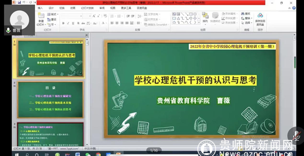 本网讯 当前,我国新冠肺炎疫情呈现点多、面广、频发的特点,防控形势严峻复杂,“外防输入、内防反弹”压力持续增加。为切实提升疫情下全省教师应对校园心理危机事件的识别和干预能力。近日,由贵州省教育科学院主办,伟德国际1949官网承办、教科院协办的2022年贵州省中小学校园心理危机干预专题培训(第一期)成功举办,各市(州)100多名专(兼)职心理辅导教师通过腾讯会议参加了培训。