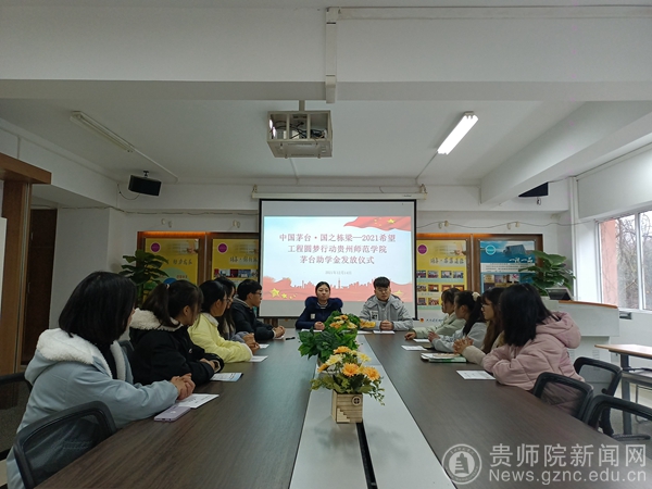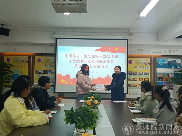 本网讯 12月14日,我校“中国茅台·国之栋梁——2021希望工程圆梦行动大型公益助学活动”助学金发放仪式在大学生活动室举行。校团委副书记伍玲婧、校团委老师马源、资助项目工作人员以及受助学生参加此次会议,发放仪式由马源主持。