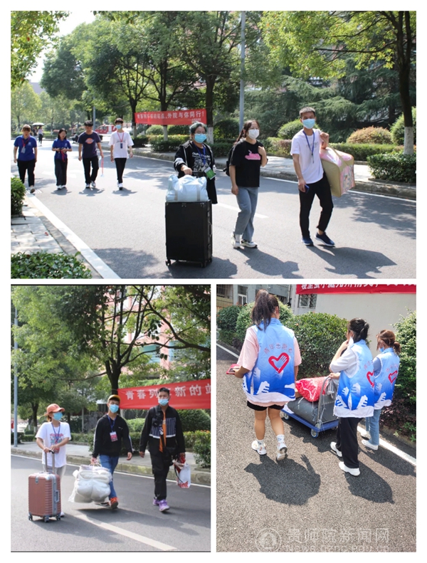 校外,迎着清晨的第一抹朝阳,志愿者们带好防护物资、引导牌前往金阳客车站、贵阳北站、贵阳东站和火车站等四个站点迎接新生入校。在志愿者的引导下,新生到登记点进行登记,前往候车区上车前往师院。在志愿者的指引和陪同下,新生如期到达师院,顺利完成报道。